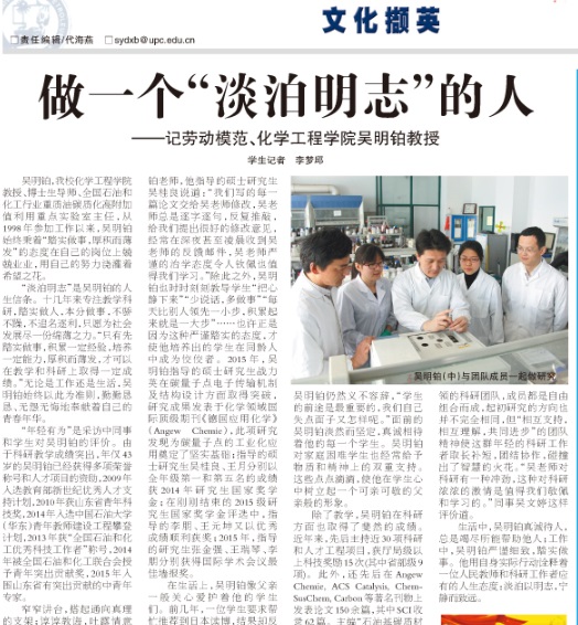 除了教学,吴明铂在科研方面也取得了斐然的成绩。近年来,先后主持近30项科研和人才工程项目,获厅局级以上科技奖励15次(其中省部级9项)。此外,还先后在Angew Chemie, ACS Catalysis, ChemSusChem, Carbon等著名刊物上发表论文150余篇,其中SCI收录62篇。主编“石油基碳质材料的制备及应用”专著一部。已获发明专利20项,实用新型专利4项。据了解,吴明铂带领的科研团队,成员都是自由组合而成,起初研究的方向也并不完全相同,但“相互支持,相互理解,共同进步”的团队精神使这群年轻的科研工作者取长补短,团结协作,碰撞出了智慧的火花。“吴老师对科研有一种冲劲,这种对科研浓浓的激情是值得我们敬佩和学习的。”同事吴文婷这样评价道。