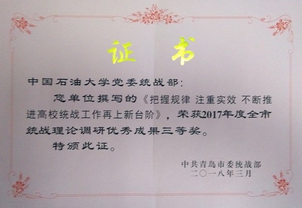 近日,全省统战部长会议和青岛市全市统战部长会议召开,党委统战部部长王德钊参加会议。会上就一年来的工作进行了总结和表彰,我校多项成果获得省市表彰。其中徐拥军、孙鹏燕、李宝玺、葛长波等撰写的《以人为本 增强认同 内地新疆籍少数民族大学生心理疏导策略研究》获全省统战理论调研宣传“四新工程”优秀理论调研成果优秀奖;党委统战部选送的《把握规律 注重实效 不断推进高校统战工作再上新台阶》获青岛市统战理论调研优秀成果三等奖。