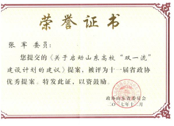近日,山东省政协下发《政协第十一届山东省委员会关于表彰优秀提案、先进提案承办单位和先进提案工作者的决定》,我校十一届省政协委员张军撰写的《关于启动山东高校“双一流”建设计划的建议》获优秀提案,5年来全省共评选120件。