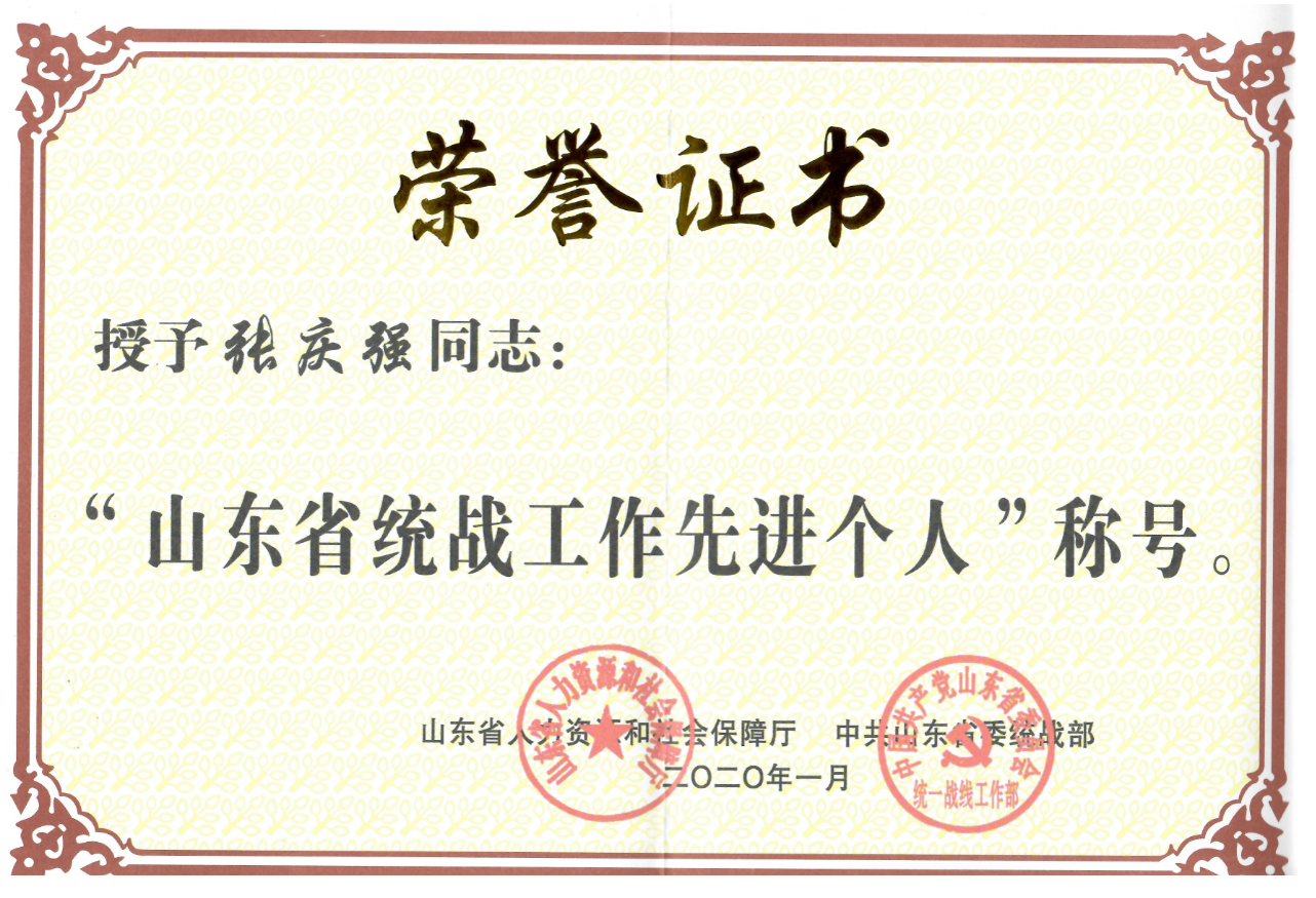 全省统战工作先进表彰活动由山东省委统战部、山东省人力资源和社会保障厅联合开展,四年评比一次,范围包括各地市、高校、科研院所、国有大型企业。本次全省共表彰先进单位36个、先进个人60人,其中高校有6个单位、9名同志获得先进称号。我校党委统战部张庆强同志荣获先进个人荣誉称号。