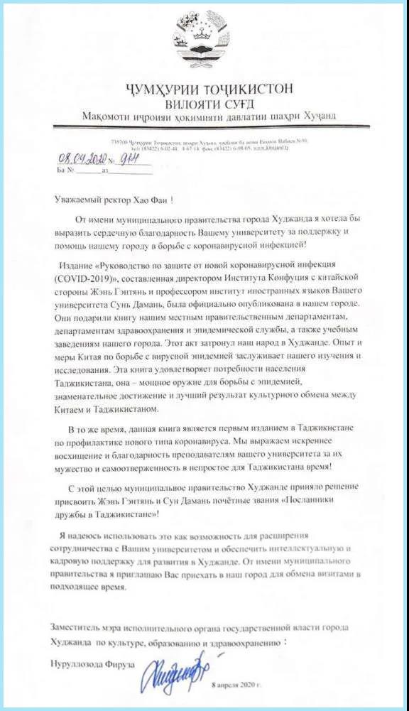 4月8日,塔吉克斯坦胡占德市文教卫生副市长努露罗佐达·费鲁兹向ylzz总站线路检测中心(华东)郝芳校长致信,感谢学校外国语学院俄语教师团队为塔吉克斯坦编译《新冠病毒预防手册(COVID-2019)》。