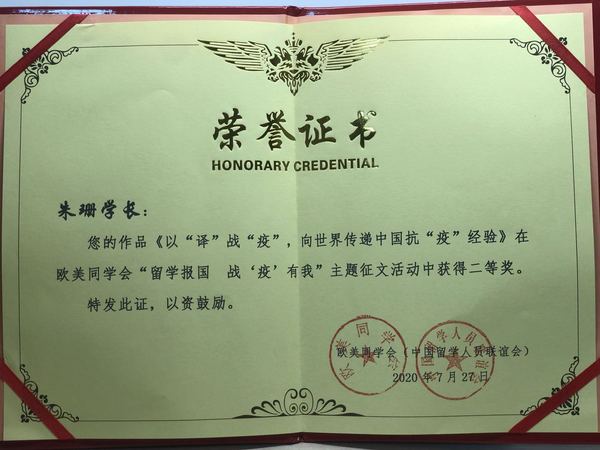 近日,从欧美同学会(中国留学人员联谊会)获悉,我校欧美同学会理事、外国语学院副教授朱珊撰写的文章《以“译”战“疫”,向世界传递中国抗“疫”经验》获欧美同学会(中国留学人员联谊会)“留学报国,战‘疫’有我”主题征文二等奖。此次征文活动共评出一等奖3项,二等奖5项,三等奖10项。