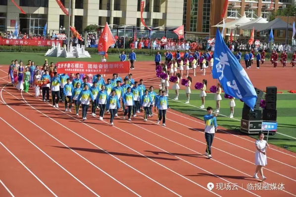 全部由我校学生运动员组成的青岛代表团方队入场