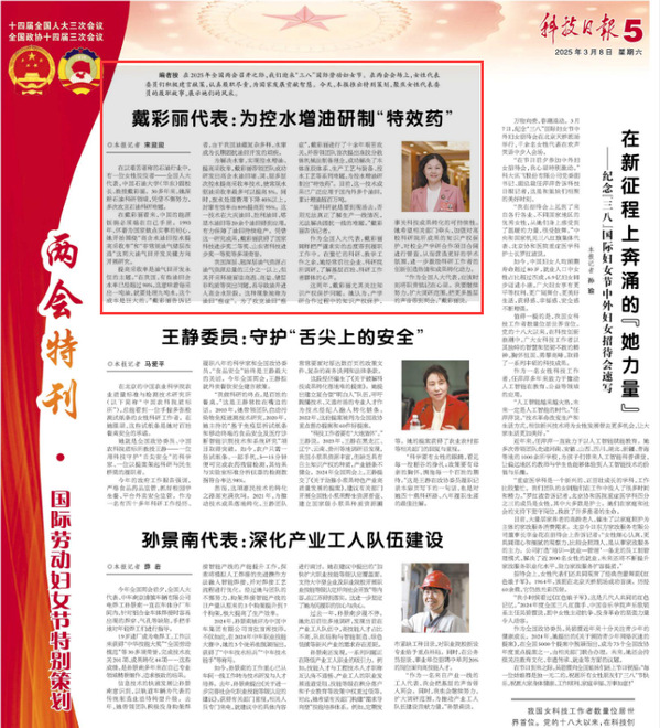 在2025年全国两会召开之际,我们迎来“三八”国际劳动妇女节。3月8日,《科技日报》推出特别策划,讲述女性代表和委员的履职故事,展示她们的风采。专刊以“为控水增油研制‘特效药’”为题对全国人大代表、我校副校长戴彩丽教授履职尽责、科研攻关的事迹进行了报道。